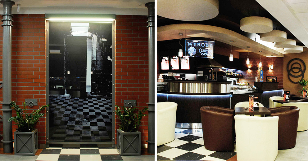 Powierzchnia objęta opracowaniem to 550m 2 w tym: komunikacja, kawiarnia, sanitariaty. Wnętrza utrzymane w klimacie starego budynku przemysłowego, z wieloma charakterystycznymi elementami i materiałami zaczerpniętymi z wnętrz oryginalnych fabryk, nie dosłownie a jedynie jako dekoracyjne detale.